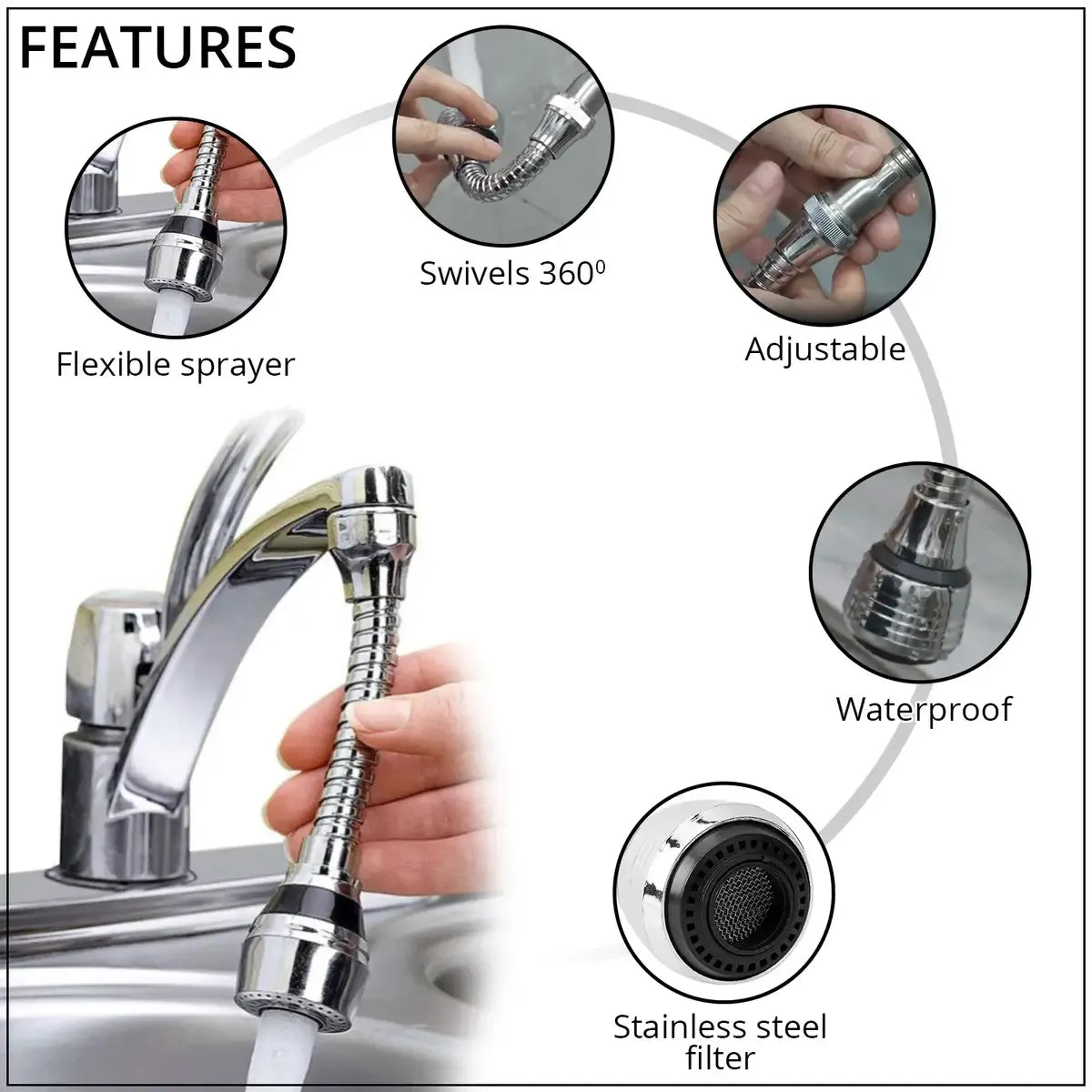 Upgrade your kitchen or bathroom sink with this 360Β° flexible faucet sprayer attachment, designed to turn a standard faucet into a hands-free, adjustable sprayer. With its fully rotating design and flexible metal neck, it allows precise water control and effortless cleaning in every corner of your sink.